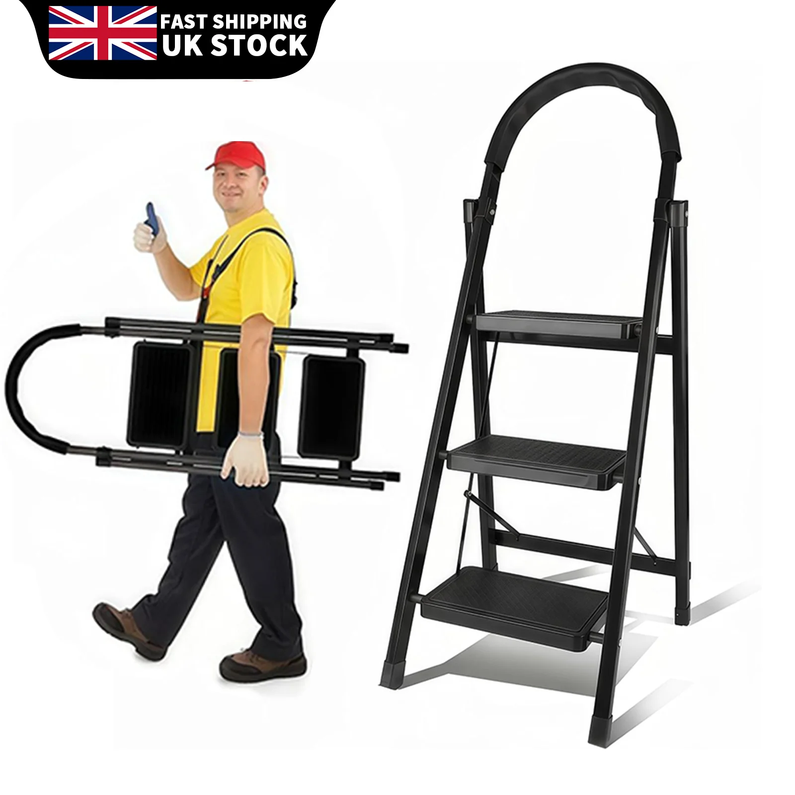 3 Step Ladder with Handrail, Non-Slip Household Ladder with Folding