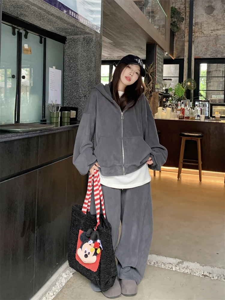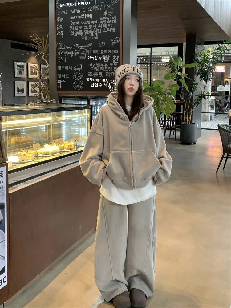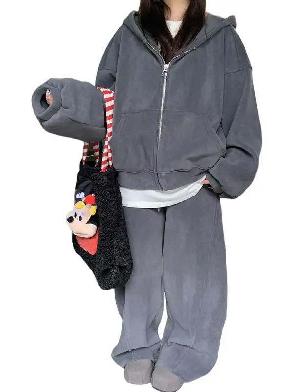 ↑Plus Size plus Size Autumn Winter New Vintage Thickened Hoodie Women's Jacket Loose Wide Leg Pants White T-Shirt Set Trendy - TopDealBox